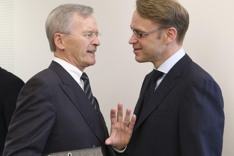 Karl Albrecht Schachtschneider (links), emeretierter Staatsrechtler, und Bundesbank-Chef Jens Weidmann unterhalten sich während der Anhörung zum EZB-Anleiheprogramm vor dem Bundesverfassungsgericht. Schachtschneider klagte gemeinsam mit Starbatty, Nölling und Hankel gegen die Griechenlandhilfe und den Euro-Rettungsschirm.