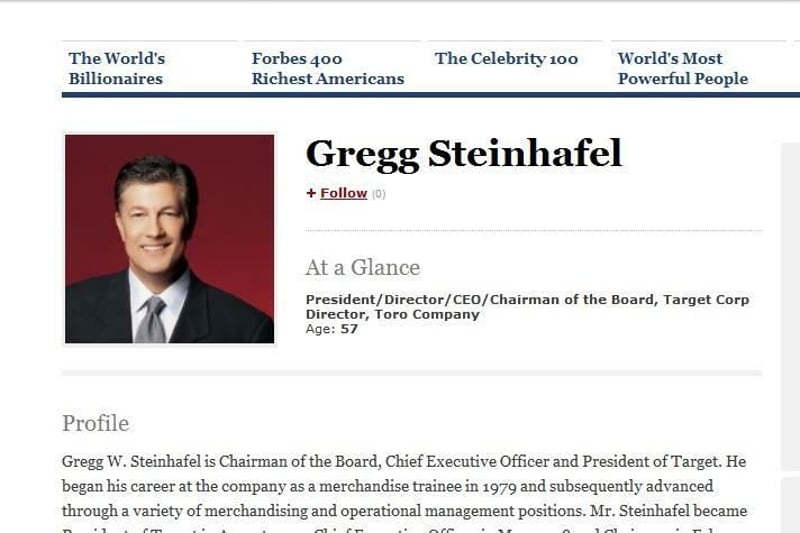 Auch er hat mal klein angefangen und kam im Jahr 1979 als Praktikant zu Target. Inzwischen ist Gregg Steinhafel Chef des zweitgrößten Discounters in den USA, hinter Walmart. Target selbst beschreibt sich als ein „Billigkaufhaus“, um nicht nur ein Discounter zu sein. Steinhafel kam laut Wirtschafts Blatt im vergangenen Jahr auf ein Gehalt von 34 Millionen Euro.