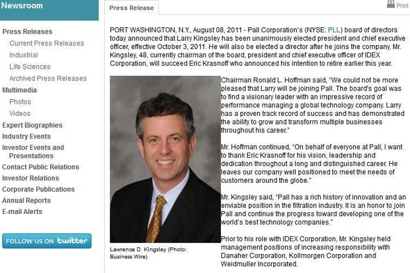 Kann man mit Feinfiltern für die Absonderung von stabilen, flüssigen oder auch gasförmigen Fremdstoffen, die in Krankenhäusern, Blutbanken, Laboren, aber auch bei Fluggesellschaften und kommunalen Wasserversorgern Verwendung finden reich werden? Man kann. Zumindest, wenn der Chef der Firma Pall ist. Lawrence Kingsley bekam im vergangenen Jahr 32,5 Millionen Euro überwiesen.