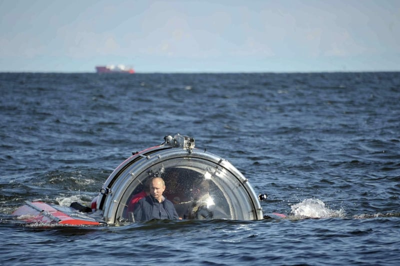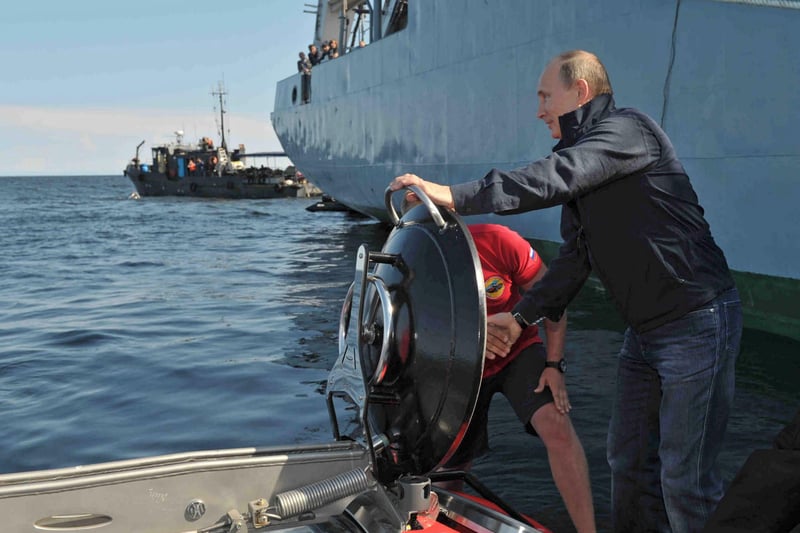 Und hier lässt er sich auf eine Fahrt in einem Mini-U-Boot ein. Eine besonders spektakuläre Expedition lieferte einmal Bilder Putins, wie er im Pazifik Wale mit einer Armbrust jagte. Allerdings nur mit dem Ziel, ihnen Peilsender zu verpassen.