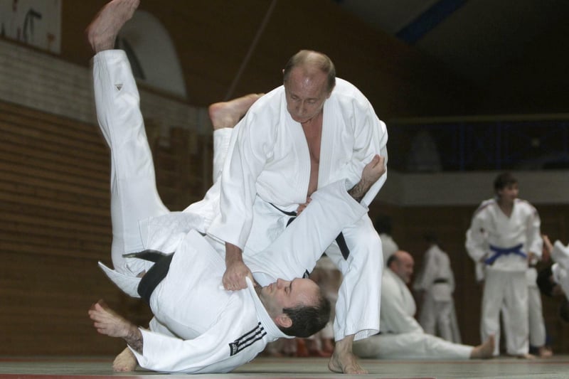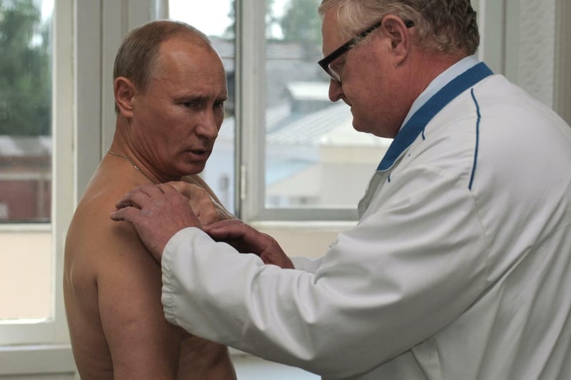 November 2002 während des EU-Russland-Gipfels auf die Frage eines Journalisten nach dem Vorgehen der russischen Armee gegen die Zivilbevölkerung in Tschetschenien. Selbst beim Arzt lässt er sich fotografieren. Auch wenn es nur um eine kaputte Schulter geht.