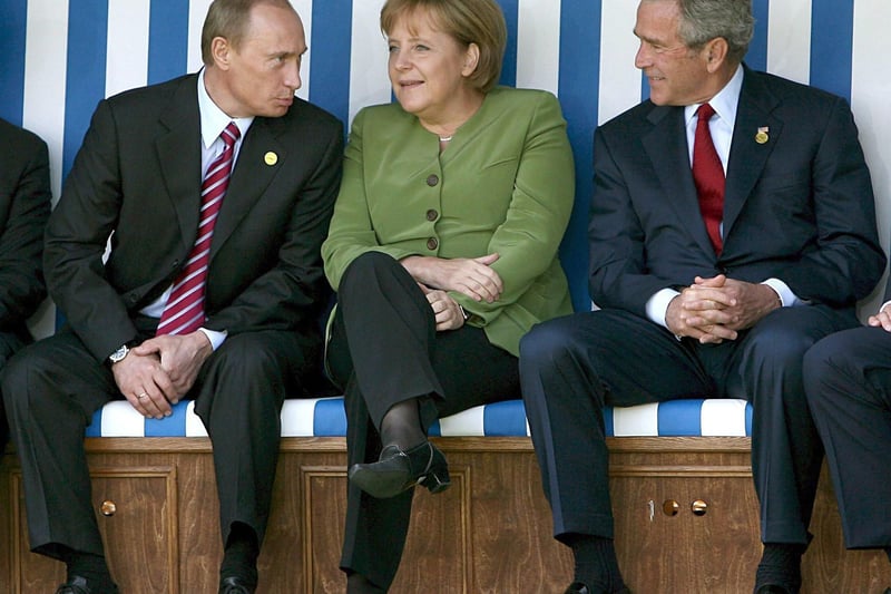 Januar 2006 über die Rolle Russlands in der Gruppe der führenden Industrienationen. Nach fetten Katern sehen Merkel, Putin (links) und der damalige US-Präsidenten Bush aber gar nicht aus, oder?