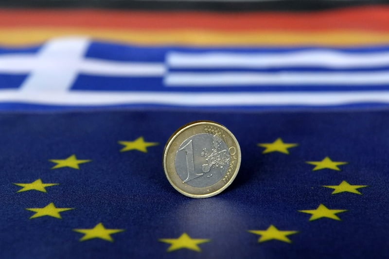 Eine Ein-Euro-Münze auf einer Fahne der Europaeischen Union, während im Hintergrund eine griechische (M.) und eine deutsche Fahne liegen.
