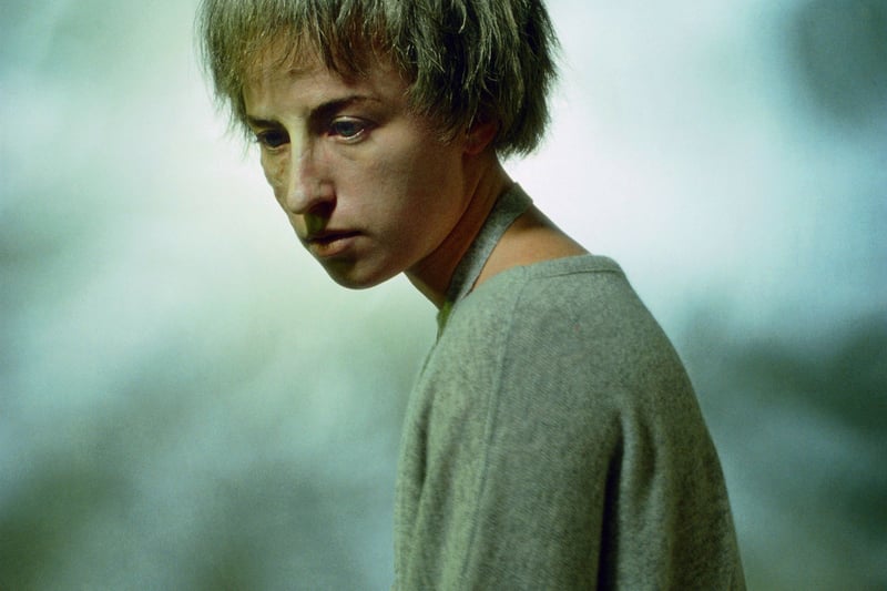 1984 erschreckt Cindy Sherman die Kreativdirektoren von Vogue in der Rolle eines fahlen Models mit zerzaustem Haar in einem Strickpulli, der in grauen Farbtönen unförmig an ihr herabhängt (Ausschnitt aus einem Hochformat).