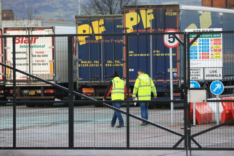 Schwerlastkraftwagen warten in der Kontrollstelle des Ministeriums für Landwirtschaft, Umwelt und ländliche Angelegenheiten an den Belfaster Docks auf ihre Überprüfung.
