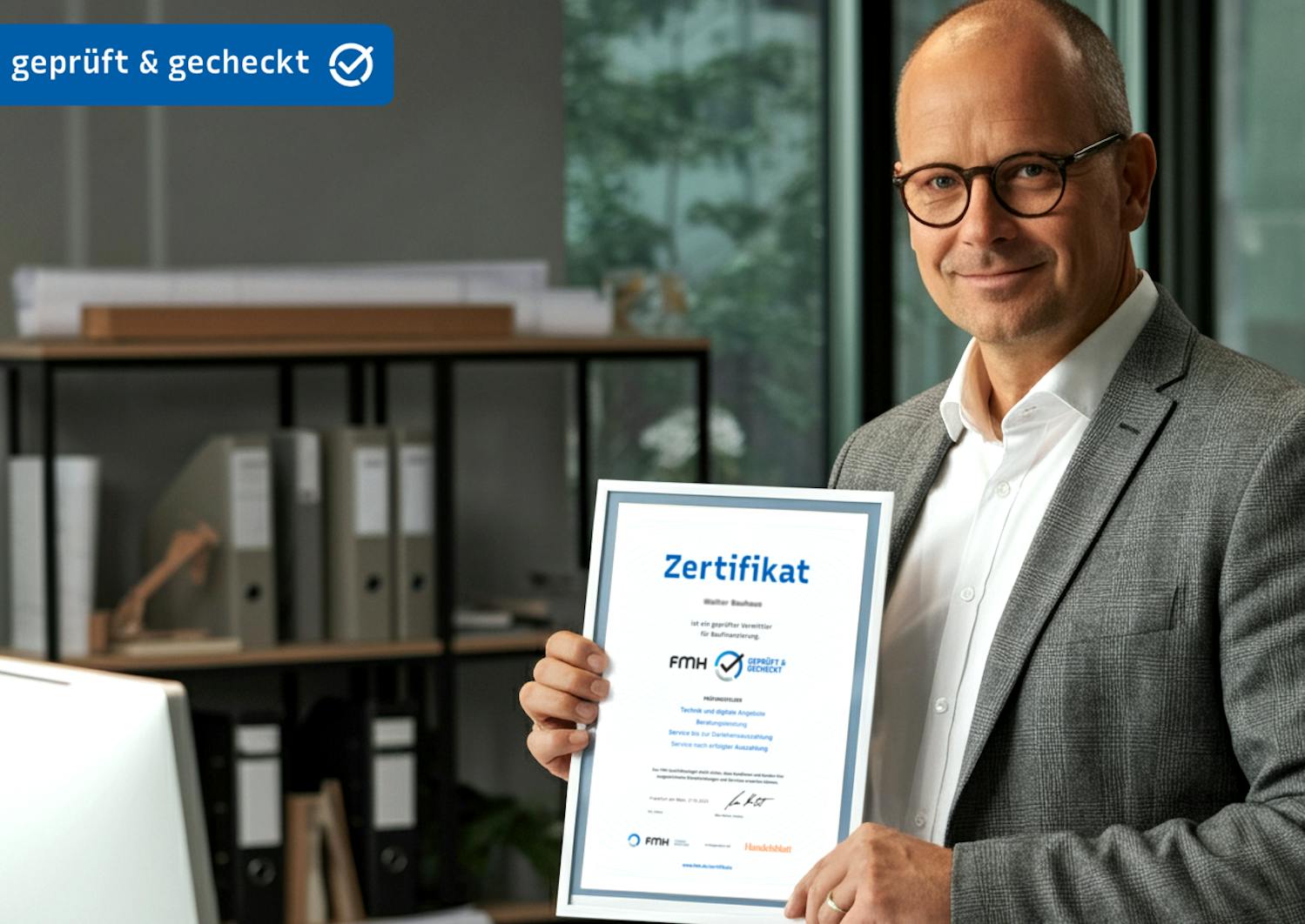 Die FMH-Finanzberatung, mit ihrer 40-jährigen Erfahrung in der Baufinanzierung, hat einen Fragebogen mit deutlich über 100 Fragen und Kriterien entwickelt, um die Vermittler vor Ort in einem persönlichen Gespräch intensiv zu prüfen. Wer den strengen Kriterien genügt, erhält ein Zertifikat.