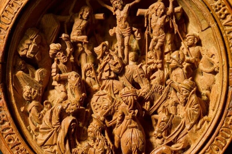 Detail aus einer aufgeklappten Gebetsnuss aus Buchsbaum, die bei Sotheby's für 605.000 Pfund versteigert wurde, zum Zehnfachen der Taxe.