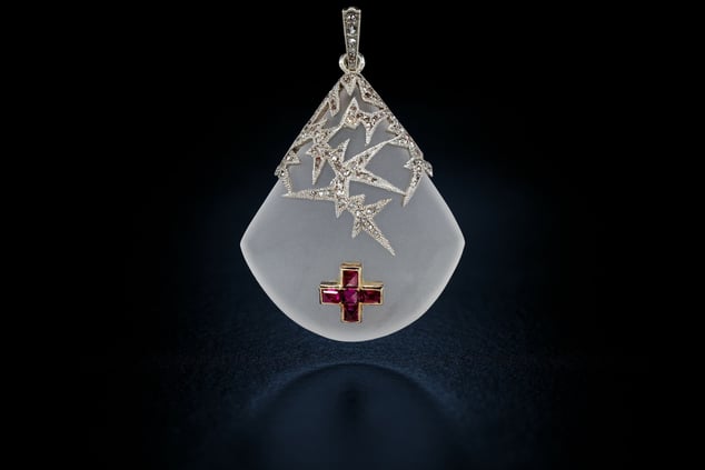 Auf dem 1915 datierten Anhänger ist ein rotes Kreuz aus Rubinen appliziert. Er erzielte unerwartete 214.000 Pfund.