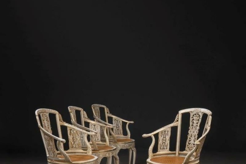 Das um 1785 gefertigte Ensemble wurde von der Witwe des Nawab von Bengalen in Auftrag gegeben. Sie waren ein Geschenk für den englischen General Warren Hastings und seine Frau. Die Stühle erzielten nach hartnäckigem Bietkampf 3,1 Millionen Pfund.