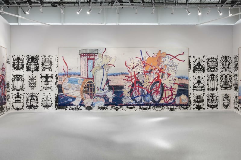 New Image Art Gallery (Los Angeles) etwa bezirzt mit Werken Umar Rashids, die seine Version der Kolonialgeschichte des 18. Jahrhunderts, nämlich aus der Sicht der Unterdrückten, in feinen Zeichnungen oder Stoffarbeiten darlegen. Sie sollen bis 18.000 Dollar kosten.