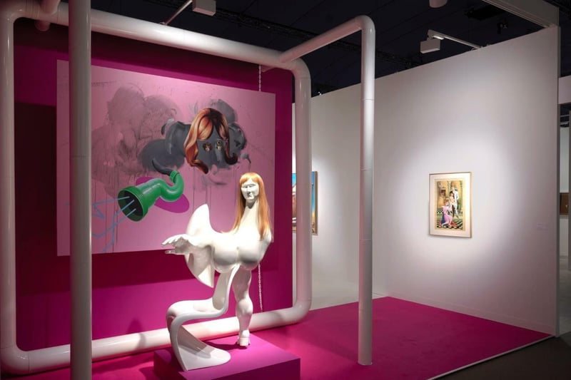 Im Vordergrund ist die Installation „Portrait of a Lady, white“ von Jakob Lena Knebl zu sehen, präsentiert auf der „Paris + par Art Basel“ im Grand Palais Ephémère.