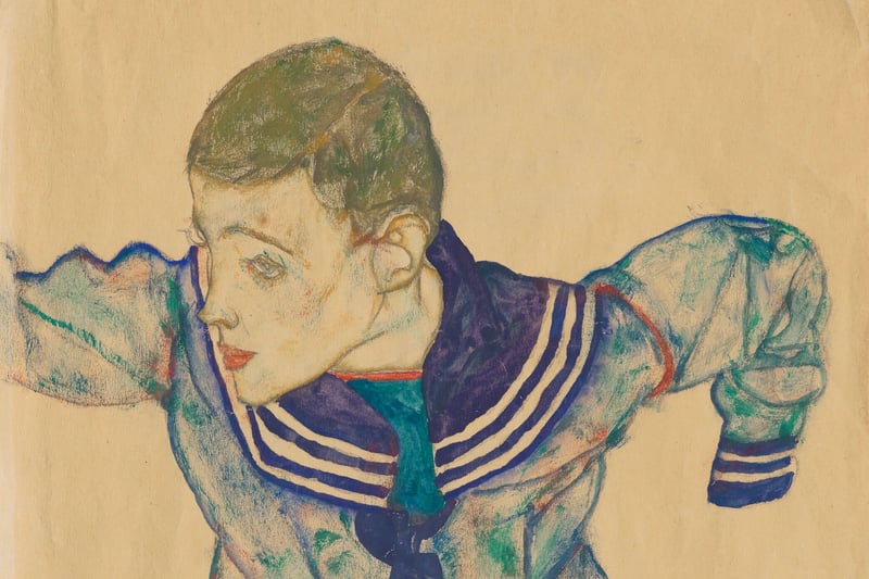 London. Der 48 mal 31 Zentimeter große „Knabe in Matrosenanzug“ stammt aus der bedeutenden Wiener Sammlung von Fritz Grünbaum (1880–1941). Grünbaum war ein österreichischer Kabarettist, Operetten- und Schlagerautor, Regisseur und Schauspieler, der auch in Berlin auftrat und arbeitete. Obwohl seine über 400 Arbeiten umfassende Kollektion auch Alte Meister beinhaltete, bewunderte Grünbaum vor allem das Talent Schieles und sammelte über 80 Werke des Künstlers – eine Pionierleistung.
