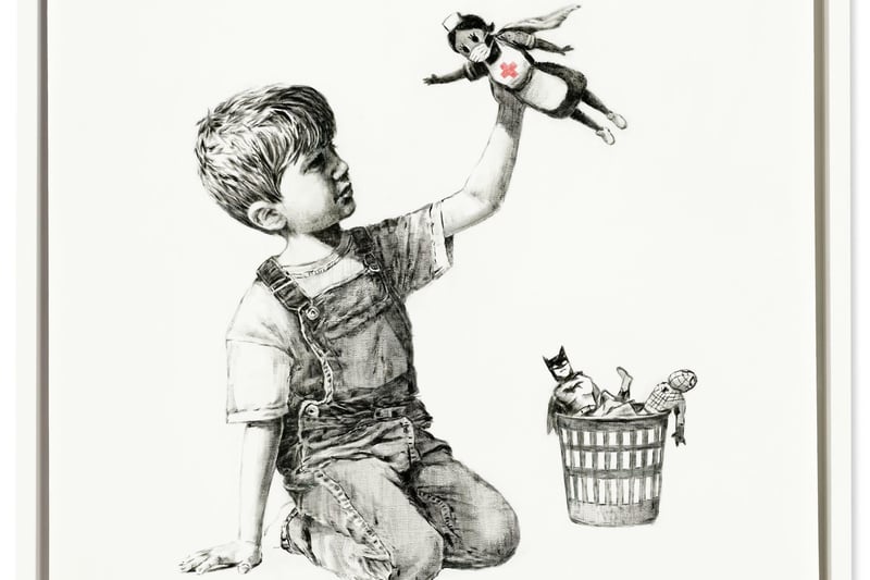 Düsseldorf. Dienstagnachmittag bezahlte ein anonymer Bieter bei dem Aktionshaus Christie’s 16,8 Millionen Pfund brutto für ein Bild von Banksy. „Game Changer“ zeigt einen knienden Knaben, der aus einem Korb eine Puppe mit einer Rot-Kreuz-Schwester gegriffen hat und hochhält. Es ist die Hommage des noch immer nicht enttarnten Künstlers an die Pflegerinnen und Pfleger, die während der Pandemie Höchstleistungen erbringen.