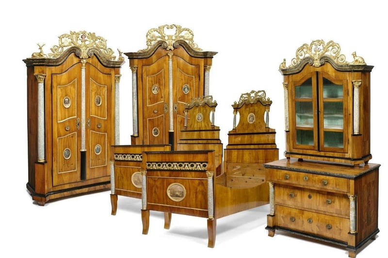 In seinen Formen dem Bauernmöbel verhaftet: das Biedemeier-Ensemble aus Bettenpaar, Aufsatzkommode und zwei Schränken aus der Zeit um 1830/40. Zeugnisse großbäuerlichen Wohlstands zu Schätzpreisen zwischen 3.000 und 4.000 Euro. Quelle: Nagel
