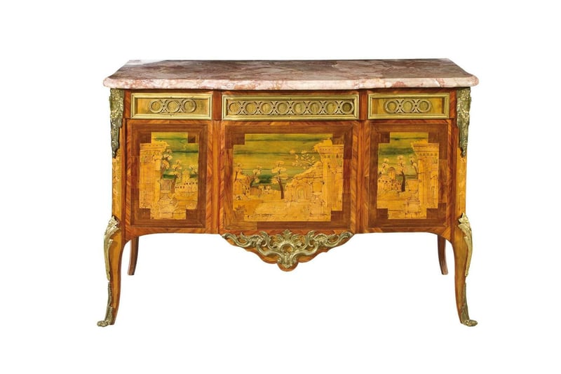 Aus einer hessischen Sammlung: Palisanderkommode mit Architekturkulissen auf der Front, Taxe 15.000 bis 20.000 Euro.