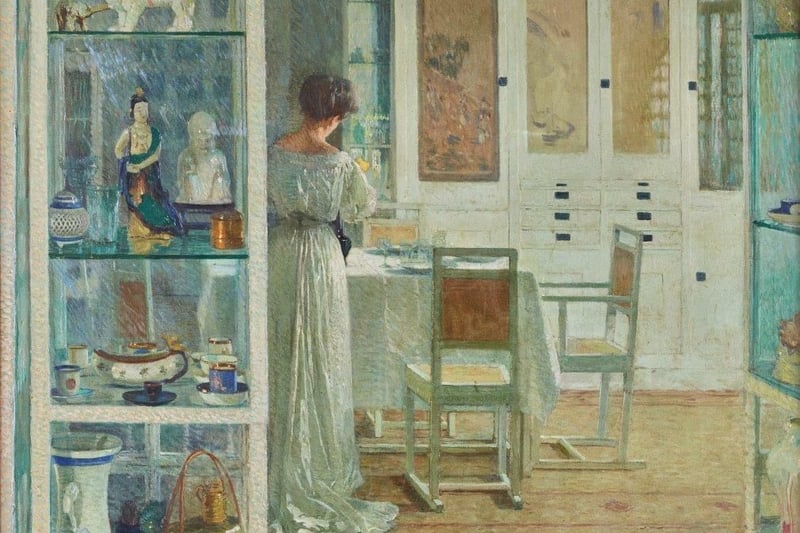 Dass diese Taxe jedoch schnell Geschichte war, lag einzig und allein am Motiv: Es zeigt Berta Zuckerkandl, die wohl prominenteste Salonlöwin im Wien der Jahrhundertwende, in ihrem Speisesalon, dem Betrachter den Rücken zugewandt. Zu erkennen sind Zeugnisse ihrer persönlichen Sammelleidenschaft für Objekte ostasiatischer Herkunft.