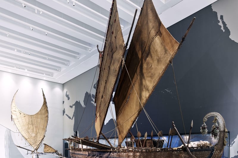 Hier begeistern die farbigen Masken und Kultkrokodile, die am Sepik-Fluss entstanden und die kraftvollen Uli-Figuren ebenfalls aus Papua-Neuguinea, die Bestattungen ritualisierten. Das Hochzeitsgewand der Fidschi und der rot-gelbe Federmantel, ein Geschenk des Königs von Hawaii an Friedrich Wilhelm III. von Preußen, sind die Augenfänger in der Abteilung polynesischer Artefakte.