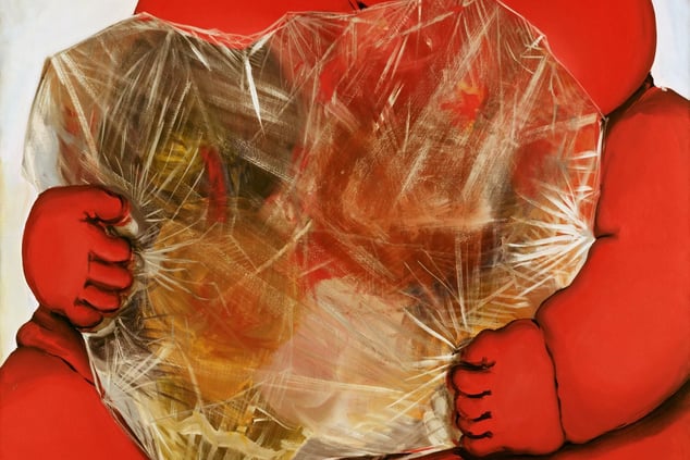 Mit Ironie reagiert der Künstler auf Kunstbetrieb und Gesellschaft. Das Motiv "Für alle Lieben in der Welt" (1966) lieferte den Titel der Münchner Schau. Es ist eine Leihgabe der Städtischen Galerie Karlsruhe.