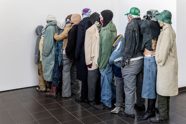 Oder Iris Kettners bestürzende Figurengruppe „Reihe“, die aus ausgestopfter Kleidung auf Holzskeletten eine Schlange vermummter Menschen geformt hat, die dicht gedrängt auf etwas zu warten scheinen. Auf ein Boot für die Flucht, einen Teller Suppe oder einen Bus, der sie irgendwo hinbringt, wo man ihre Armut nicht mehr sehen muss?