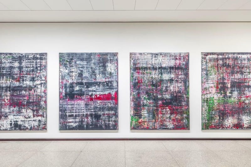 2016 und 2017 entstanden die meisten der hier so übermächtigen abstrakten Bilder. Es war die letzte Werkreihe, in der Richter Bilder in dieser Technik schuf. Danach konzentrierte er sich auf Papierarbeiten, die auf den ersten Blick wie farbgesättigte Aquarelle wirken, aber mit dicht fließenden Glasmalfarben aufgetragen wurden. Reichlich sind auch seit den Neunzigerjahren übermalte Fotografien entstanden, von denen einige immer wieder in deutschen Auktionen erscheinen.