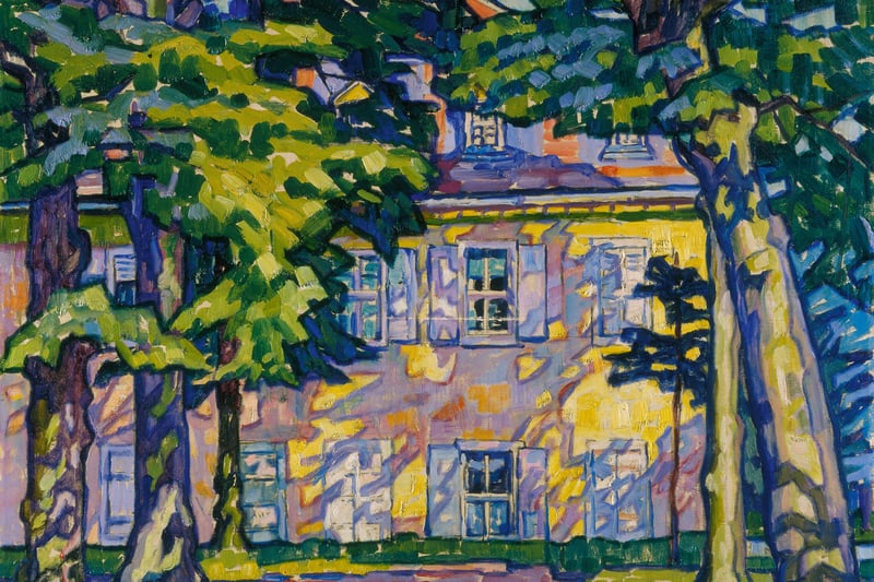 Frankfurt. Starker Schatten fällt in fliederfarbenen Flecken auf die gelbe Fassade eines ansehnlichen Hauses. Eine Allee von Laubbäumen bricht das starke Mittagslicht. Es muss heiß sein in „Wilhelmsbad“. So hat die Malerin Eugenie Bandell (1858-1918) die flirrende Luft und den Tanz der Farbflecken 1913 mehrfach gemalt: mit breitem Pinselstrich in Komplementärfarben, avantgardistisch ohne Perspektive wie ein japanischer Holzschnitt.