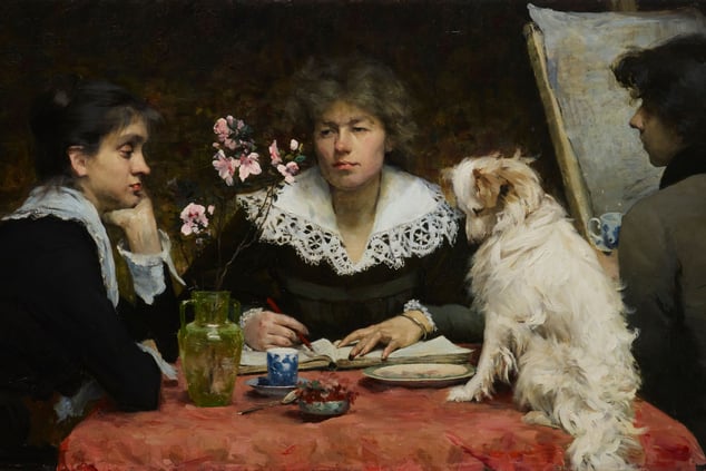 Louise Breslau erfasst im „Porträt der Freunde“ 1881 drei Künstlerinnen frei von Konventionen um einen Teetisch. Die Damen sind mit dem Nachdenken über Kunst befasst, sogar der Hund darf auf den Tisch – in Denkerpose. Breslau wird später in der berühmten Pariser Galerie Durand-Ruel ausstellen und zahlreiche Preise gewinnen.