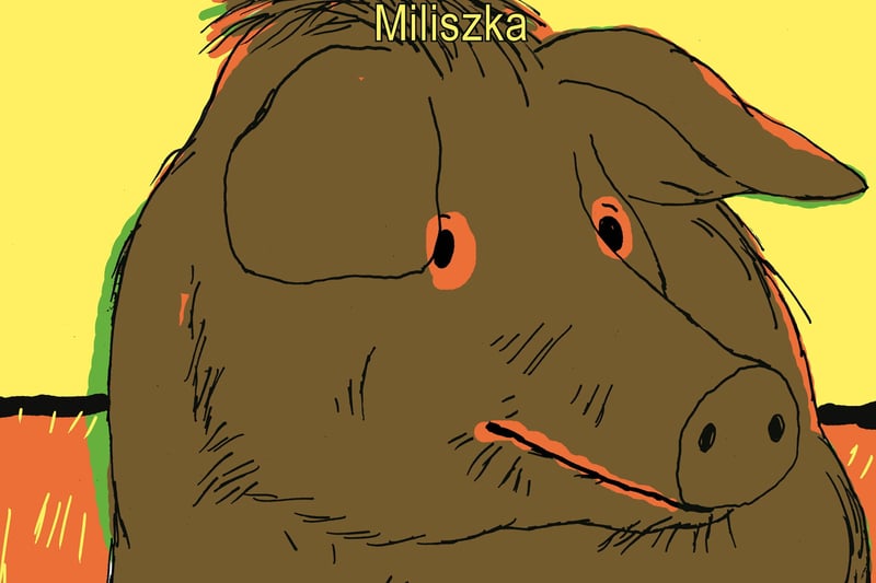 Ein Mitglied der Schweinefamilie namens „Miliszka“, gezeichnet 2023 von der Comiczeichnerin Anna Haifisch. Anja Koch betreibt den Betrieb Fläminger Weideschweine und ist Halterin der porträtierten Tiere (Ausschnitt).
