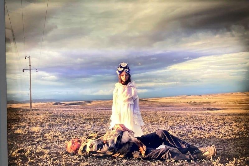 Die Kasachin inszeniert in einem Foto ein Kind in der Weite der Steppenlandschaft. Davor liegt ein alter Mann mit einem vermutlich toten Schaf in den Armen. Ein Bild vom Ende der Hoffnung.