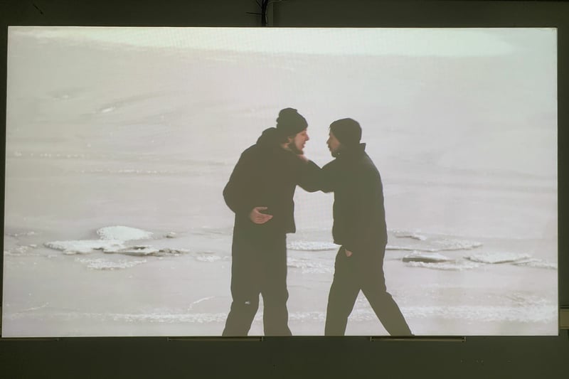 In einem Video sieht und hört man dunkle Flüssigkeit aus einem Rohr einströmen in einen Fluss. Davor gelagert wie barocke Flussgötter das Künstlerduo Daniil Revkovskiy und Andriy Rachinskiy. Sie sagen etwas, das wie ein „Blubb, blubb, blubb“ in nerviger Dauerschleife klingt.