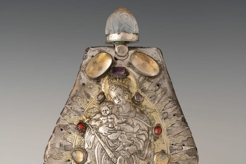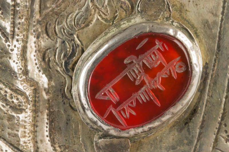 Damit passt der einst als abstrakte Schachfigur geschaffene Bergkristall programmatisch eben doch zum Marienrelief. Genauso wie das Siegel mit arabischer Schrift. Arabische Buchstaben assoziierten Gebildete damals mit dem Heiligen Land und deshalb mit der Heilsgeschichte des Christentums. Das Siegel und der Kristall wurde aus Verehrung in das Reliquienbehältnis eingefügt.
