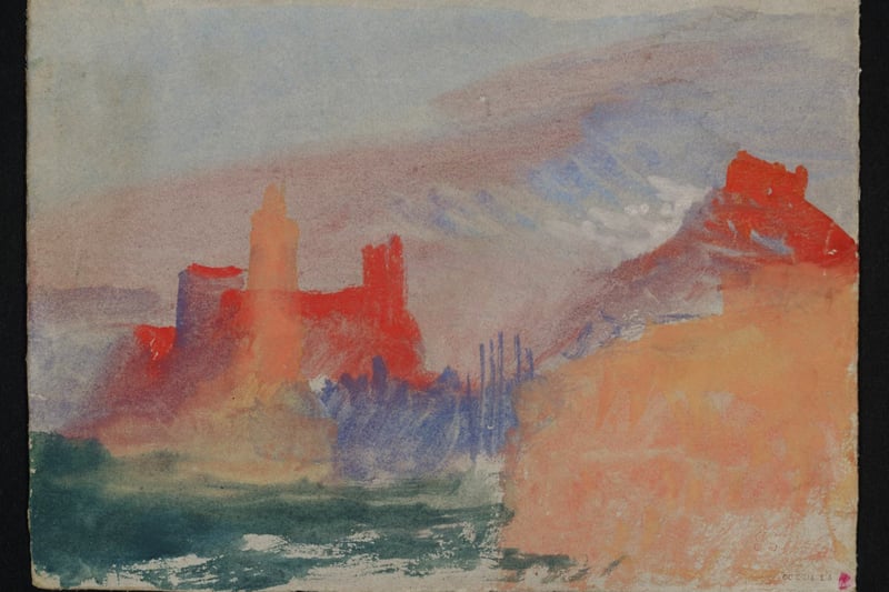 Mit schnell getuschten, abstrahierten Farbblöcken hielt Turner seine Erinnerung an eine imposante Küstenlandschaft in Südfrankreich um 1834 fest.