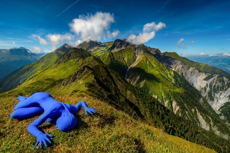 Lita Albuquerque gibt mit ihrer tiefblauen Kauernden Rätsel auf. Warum liegt die Frau auf dem Schlüchtli oberhalb von Tenna im Safiental? Warum ist sie blau? Schwächelt sie oder beschützt sie etwa Berge und Kräuterwiesen? Auf letzteres deutet der Titel „Transparent Earth“.