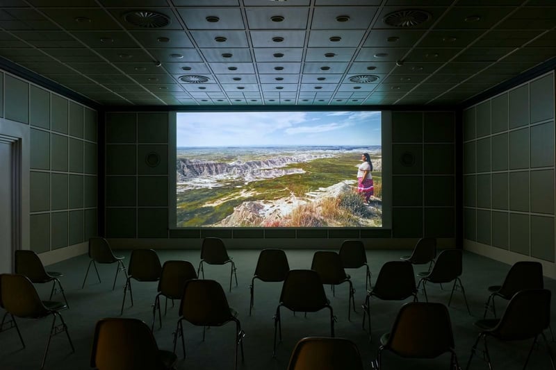 Unbesetzte Stuhlreihen vor der Videoarbeit von Andrea Bowers Videoprojektion "My Name Means Future" aus dem Jahr 2019/2020. Das über 50-minütige Video ist eine Leihgabe aus der US-Sammlung Mitchell & Emily Wie Rales und Teil der aktuellen Bowers-Schau.