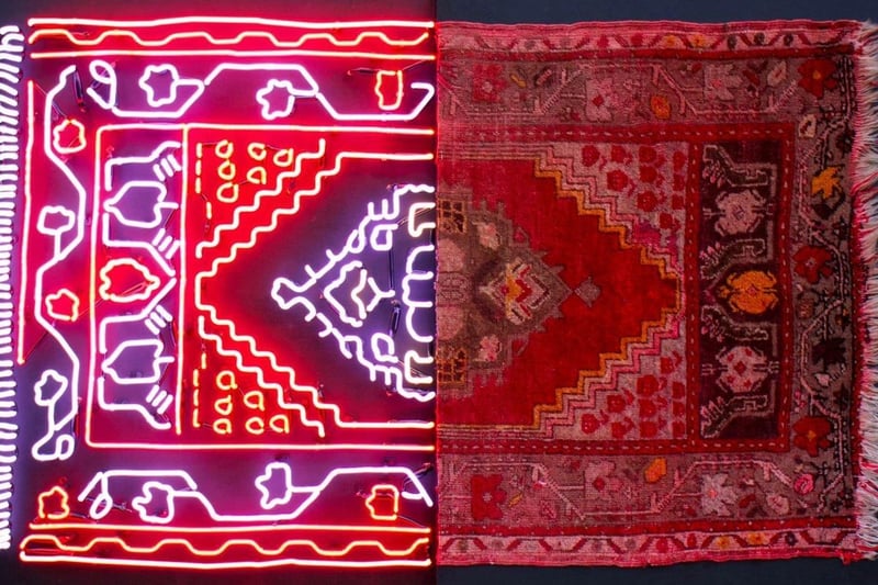 Auf dem Stand der Galerie Anna Laudel ist diese aus Teppich und Neonröhren zusammengesetzte Collage zu finden. „Feel at Home 10“, fast 150 Zentimeter breit, entstand 2022.