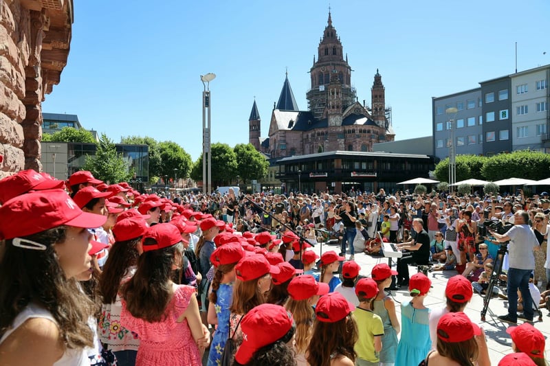 Grundschulkinder singen vor dem Staatstheater in Mainz mit Blick auf den Dom.