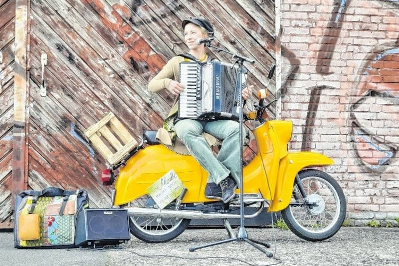 Lübeck. Die „Schwalbe“, Farbton Saharabraun, strahlt in der Frühlingssonne. Am gut gepflegten Moped aus DDR-Produktion lehnt Jana Nitsch, im Arm ihr Akkordeon. Der sehnsuchtsvolle Klang ihres Instruments und ihre kräftige Stimme füllen den Platz vor der Wichernkirche im Lübecker Stadtteil Moisling. Jana Nitsch, Schmuckdesignerin, Dichterin, Sängerin mit Straßenmusik-Vergangenheit, singt französische und deutsche Chansons.