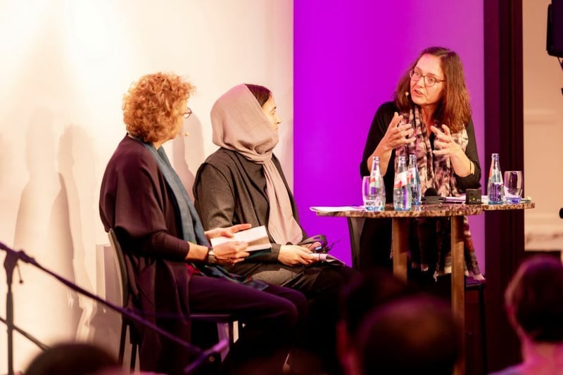 Die Frauen schreiben unter Pseudonym und dürfen nicht erkannt werden. (Von li. nach re.) Annika Reich (Weiter schreiben), Batool H. (Autorin) und Beate Tröger (Moderation).