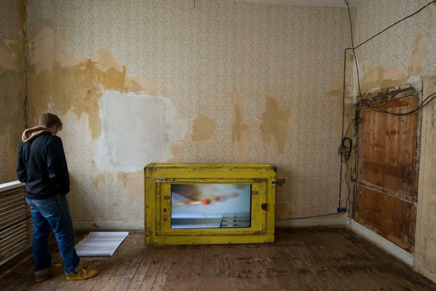 Video-Gucken im Gesamtkunstwerk "Hugenottenhaus" von Theaster Gates (USA). Foto: Boris Roessler