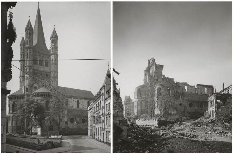 Die romanische Kirche Groß Sankt Martin, vor dem Krieg (li.) und in stark zerstörtem Zustand 1946.