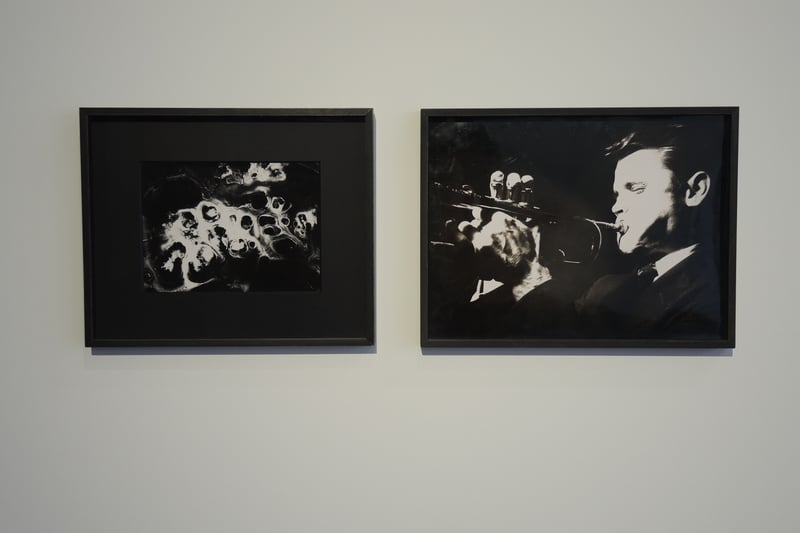 Als Ensemble gehängt: die abstrakte Lichtgrafik Chaos II von 1948 (li.) und das Profilbildnis des Jazztrompeters Chet Baker von 1961 in der Galerie Julian Sander.