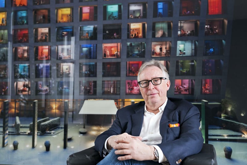 In einem großzügigen Besprechungsraum dominiert ein erzählerisches Kunstwerk eine Ecke mit Stahlrohrmöbeln: die großformatige Fotoarbeit „Saturday Night“ von In Sook Kim. In das bunt leuchtende Lichtbild eines Gebäudes im Düsseldorfer Hafen baute die aus Korea stammende Schülerin von Thomas Ruff Dutzende von minutiös inszenierten Einzelszenen. Alle erzählen, was an einem Samstag in einem Hotel passieren kann: Sex, Mord, Selbstmord, Langeweile, Trostlosigkeit, Einsamkeit, Besäufnis. Ob das dem Mainstreamgeschmack entspricht oder nicht, ist Wemhöner egal. „Was ihn ausmacht, ist seine aufgeschlossene Neugier, auch dieses manchmal stille Beobachten“, sagt Roland Nachtigäller, Direktor des Museums Marta, über seinen Weggefährten. „Er scheut das Abenteuer der Kunst nicht, schätzt deren Herausforderungen und fürchtet auch deren Provokationen nicht.“