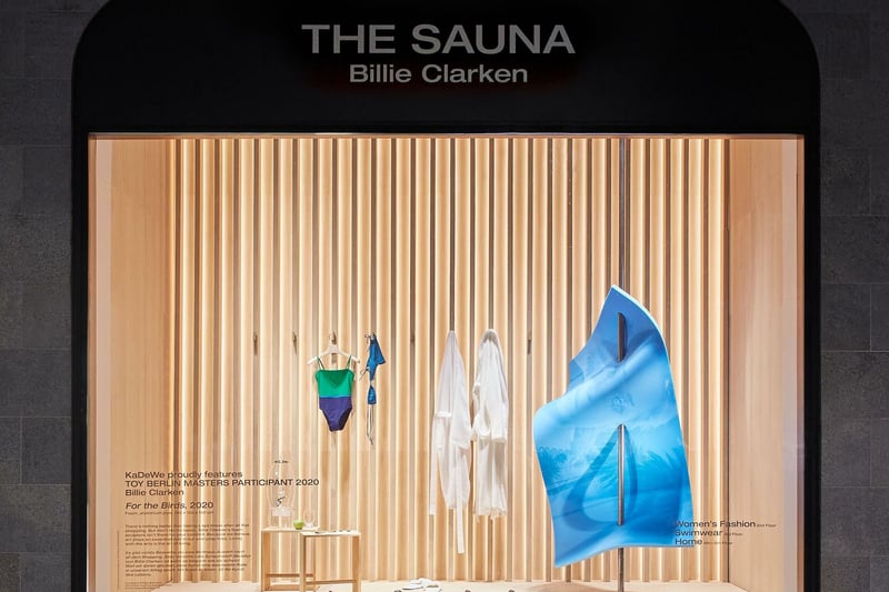 Im Schaufenster „Sauna“ präsentiert sich neben Badeanzügen und -mänteln die blaue Standskulptur „For the Birds“.