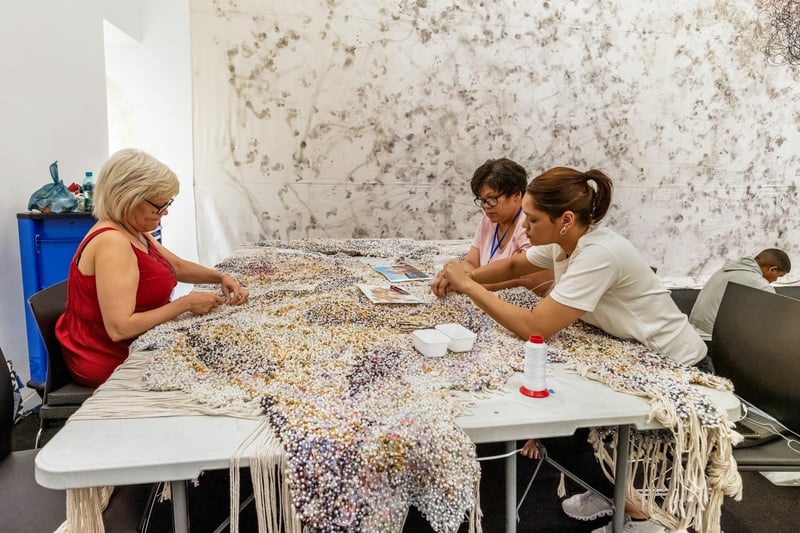 Rund 20 Mitarbeitende sind am Werk, ein großer Webstuhl ist aufgebaut, an dem fünf Frauen nach seinen Vorlagen weben. In einem anderen Raum sind spektakulär all die Materialien gestapelt, die er verwendet: Garnrollen aus recycelter Wolle, Baumwolle, Polyester, Mohair, dazu Kisten mit Perlen, Muscheln, Knochen, Goldkettchen, aber auch Linoleum, Draht, getrockneten Pflanzen. Dieser vielteilige Materialschatz ist zugleich Werkzeug und Inhalt der kunstvollen Webarbeiten. Jedes Element hat eine Bedeutung, die auf die Geschichte Südafrikas verweist, von der Apartheid bis heute.