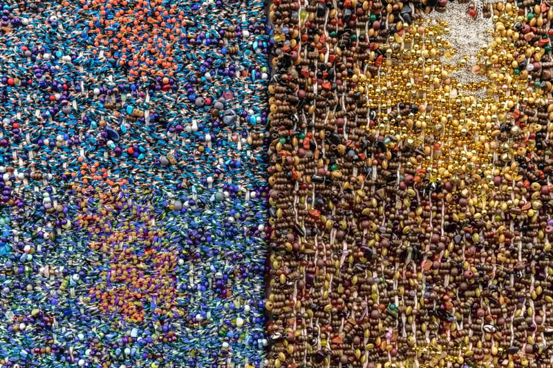 Politisches, Religiöses, Rassistisches und Spirituelles ist dabei im Spiel. Igshaan Adams Tapisserien bergen im Subtext viele Erzählungen aus dem Township bei Kapstadt, in dem er aufwuchs. Teils wirken die Wandteppiche wie Luftaufnahmen breiter Flüsse, oszillieren wie mythische Landschaften. Andere enthalten Spuren urbaner Raster, geheimer Gänge, Fußwege, die die Bewohner zurücklegten, um Kontakte zu Nachbargemeinden zu halten - was das Apartheidregime einst unterbinden wollte.