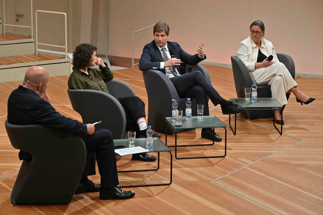 In der ersten Paneldiskussion ging es um das Thema Wahrheit und die Frage, welchen Beitrag Kunst und Wirtschaft zur Diskurskultur leisten können. Moderator Jörg Thadeusz stieg in die Diskussion mit Petra Scharner-Wolff (CEO Otto Group), Moritz Schularick, Präsident des Kiel Instituts für Weltwirtschaft, und Lena Gorelik, Literaturpreisträgerin 2022, ein mit der Frage „Wann haben Sie das letzte Mal gelogen?“. Die Diskussion kreiste um Fakten, Fake-News und Spielräume der Wahrheit.