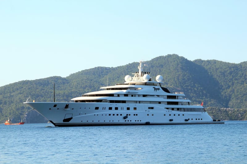 Die Luxusjacht hat alles, was das Ansehen erhöht – zwei Heli-Landeplätze, 26 Schlafzimmer, Kino, Gym und Konferenzraum.