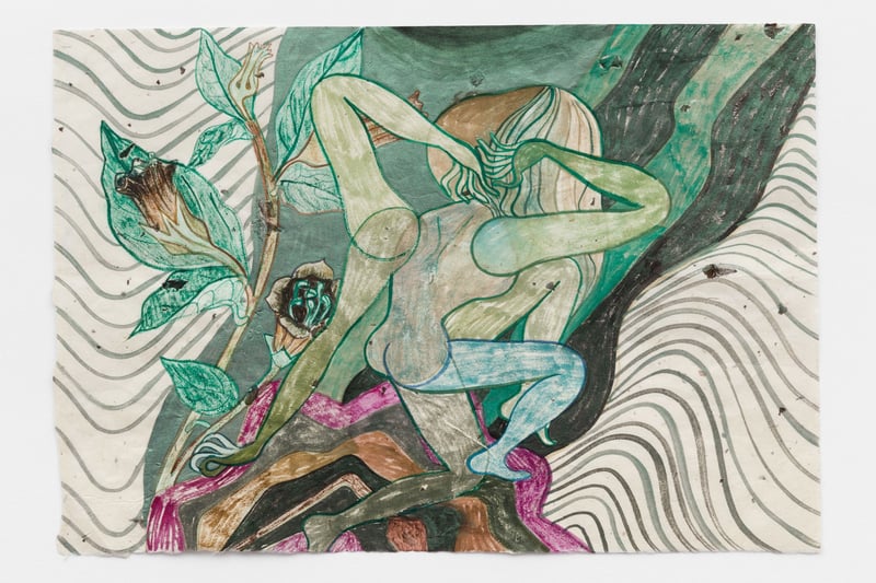 Die mit Wasserfarben auf Khadi-Papier gemalte Arbeit „Untitled“ von 2022 ist bei Petra Rinck und Onrust zu entdecken.