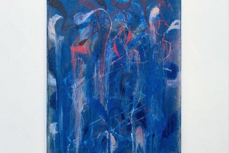 Das abstrakte Kleinformat in leuchtendem Blau mit rätselhaften Zeichen stellt die Galerie Zeller van Almsick aus Wien aus (Detail). Quelle: Sotheby’s Artist Quarterly, Foto: Philipp Schuster