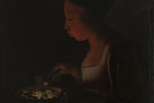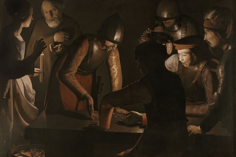 1650, zwei Jahre vor seinem Tod, malte de La Tour, vermutlich unter Mithilfe seines Sohnes Etienne, die „Verleugnung Petri“. Jesus war verhaftet worden, Petrus war ihm gefolgt, wurde von einer Dienerin als Galiläer erkannt – und leugnete, zu Jesus zu gehören. Bei de La Tour ist die Szene in einem dunklen Zimmer angesiedelt: Ein Haufen Soldaten an einem Tisch ist ins Würfelspiel vertieft, am rechten Bildrand starrt einer von ihnen aber auf den Vorgang daneben. Dort ist eine Magd mit Kerze zu sehen, deren Flamme Licht auf den weißbärtigen Mann neben ihr wirft: Petrus. So dramatisch der Augenblick, der Kipppunkt der Szene, auch ist – Hauptakteur ist nicht Petrus: Star des Gemäldes ist wieder einmal das Licht. Denn mit seinen beiden teils verdeckten Lichtquellen, eine beleuchtet das Würfelspiel, die andere die Verleugnungsszene, erzählt dieses Bild auch von Konflikten, wie sie während des zwischen 1618 und 1648 ausgetragenen Dreißigjährigen Kriegs geherrscht hatten, der als Religionskrieg begann und als Territorialkrieg endete.