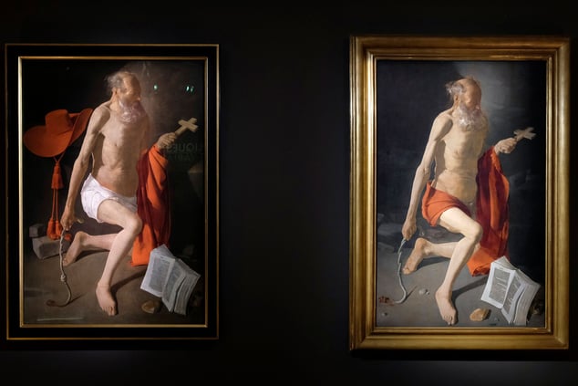 In der Schau gut zu sehen ist sein singulärer Ansatz anhand zweier Gemälde gleichen Motivs, die den reuigen Hieronymus zeigen. Fast lebensgroß hat er den Heiligen 1630 dargestellt. Verblüfft hier bereits die Präsenz des alternden Körpers, so erscheinen die arthritischen Gelenke, hängenden Muskeln, verformten Füße im links davon präsentierten Geschwister-Bild noch gnadenloser. Bei diesem Hieronymus, vermutlich im gleichen Jahr gefertigt, ist die körperliche Ausgezehrtheit durch den leuchtend roten Kardinalshut und das weiße Lendentuch – kein rotes wie beim Gegenstück – noch stärker herausgearbeitet. Interessant ist auch, dass die durch die Selbstgeißelung entstandenen Wunden des Heiligen, die sich auf seinem Rücken befinden müssen, nicht gezeigt werden. Nur die blutige Kordel in Hieronymus’ Hand verweist auf sie. So wird die Vorstellungskraft des Betrachters angeregt, das Publikum im wahrsten Sinne in den Bildraum hineingezogen.